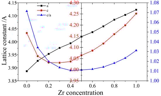 As shown in Figure 3, as compared to PbTiO3, the lattice constant a of the Zr-doped tetragonal phase Pb(ZrxTi1–x)O3 increases and the lattice constant c decreases, which indicates that the phase of Pb(ZrxTi1–x)O3 gradually shifts from tetragonal to cubic with the increase in the Zr content. At room temperature, the structure of PTZ depends on the ratio of Zr/Ti in the composition, with pure PbZrO3 having a cubic structure and pure PbTiO3 having a tetragonal structure. The tetragonal structure of PbTiO3 is distorted if some of the Ti4+ is replaced by Zr4+ in PbTiO3. When the Ti/Zr ratio is above 48/52, ferroelectric phases with another rhombohedral structure are formed. Duan et al. [35] investigated the structural phase transition of tetragonal PbTiO3, the first transition was from tetragonal to cubic phase at low pressure and the second transition was from cubic to tetragonal phase at high pressure, which is approximately the change in the tetragonal phase axial ratio in this calculation.