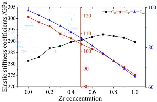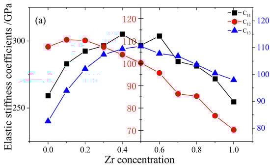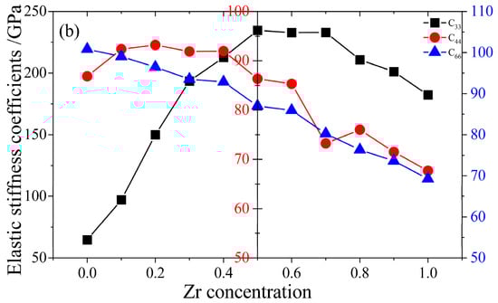 Figure 5 shows the changes in the elastic constants of the tetragonal phase Pb(ZrxTi1−x)O3 with different Zr doping ratio. As seen in the figures, C11, C13 and C33 all increase and then decrease with the increase in Zr content. When the doping ratio of Zr is about 50%, there is a turning point in the variation in C11, C13 and C33 values, where the maximum values are obtained, while C12, C44, and C66 gradually decrease with the increase in Zr content.
