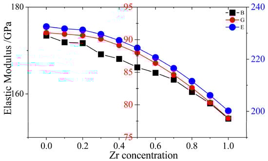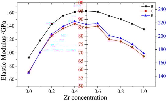 The relationship of elastic modulus with different Zr doping ratio in tetragonal phase Pb(ZrxTi1–x)O3 are showed in Figure 7. As shown that with the increase in Zr content, the bulk modulus B, shear modulus G, and Young’s modulus E of Pb(ZrxTi1−x)O3 increase and then decrease, and the modulus takes a great value when the Zr content is around 0.5, which indicates that among the tetragonal phases of Pb(ZrxTi1−x)O3, Pb(Zr0.5Ti0.5)O3 has the best mechanical properties.