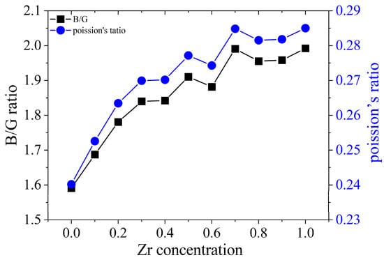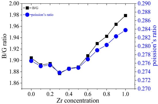 The B/G value and Poisson’s ratio of Pb(ZrxTi1−x)O3 with different Zr doping ratio in tetragonal phase.