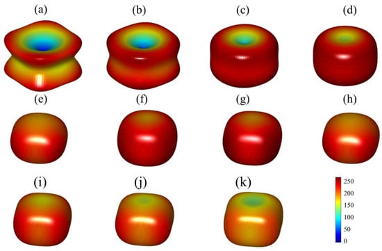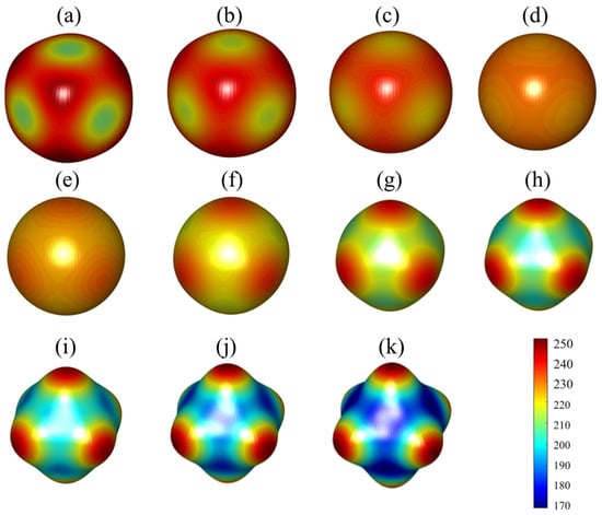 The elastic anisotropy of a material clarifies that a material exhibits different elastic properties in different directions. The anisotropy of a material can be represented by plotting a three-dimensional Young’s modulus surface in the crystal direction. For isotropic materials, the 3D surface plot is a circular sphere, and the greater the anisotropy, the greater the deviation of the surface plot from the sphere. The 3D anisotropy plots of Young’s modulus for cubic and tetragonal phase Pb(ZrxTi1−x)O3 with different Zr contents are shown in Figure 10 and Figure 11, respectively.