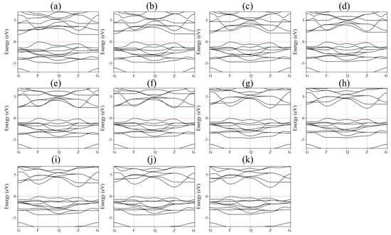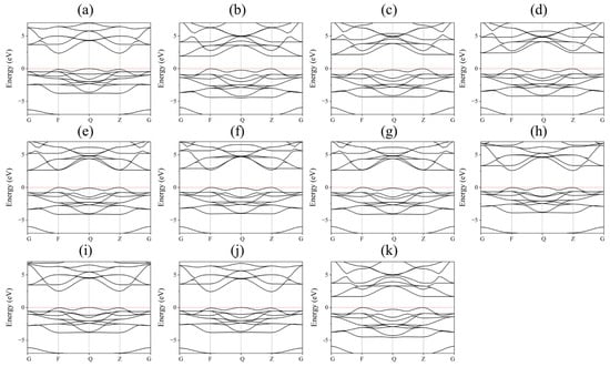 The energy band structure of cubic-phase Pb(ZrxTi1−x)O3. (a) PbTiO3, (b) PbZr0.1Ti0.9O3, (c) PbZr0.2Ti0.8O3, (d) PbZr0.3Ti0.7O3, (e) PbZr0.4Ti0.6O3, (f) PbZr0.5Ti0.5O3, (g) PbZr0.6Ti0.4O3, (h) PbZr0.7Ti0.3O3, (i) PbZr0.8Ti0.2O3 (j) PbZr0.9Ti0.1O3, (k) PbZrO3.