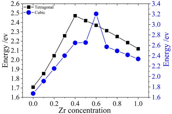 As can be seen from the figure, both in the cubic phase and the tetragonal phase, the bandgap width increases and then decreases with the increase in Zr elemental concentration, and the bandgap width is the largest when the Zr content is about 0.5. The graphical trend shows that the dispersion of PZT in the energy band diagram increases with increasing Zr doping content, which indicates that the electronic states, especially the valence band electrons, appear to be more active, and the electrons at lower energies are more unstable relative to each other.
