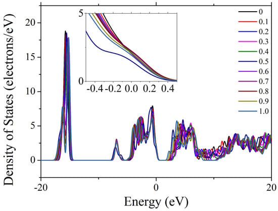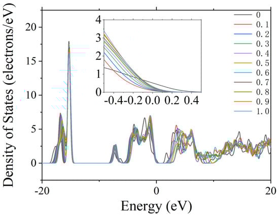 The strength of interatomic bonding in crystals is reflected by the modulus of elasticity, and the information at the high symmetry points in the Brillouin zone is reflected by the energy band diagrams. However, in order to further elucidate the number of electrons near a certain energy level in Pb(ZrxTi1−x)O3, the distribution of electrons in various orbitals and the bonding between the atoms, the density of states of Pb(ZrxTi1−x)O3 is calculated in Figure 15 and Figure 16.