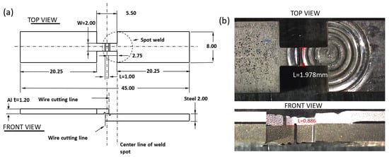 The mini shear specimens (Figure 2) were used to determine the shear strength of thin IMC layers in both large and small size Al–steel RSWs. The mini-shear test specimens were loaded onto an MTS with a load cell of 5 kN. The loading rate was set as 0.3 mm/min. The displacement–force curve was recorded until the fracture occurred. At least five specimens were conducted for each stack-up. The average shear strength was calculated and reported.