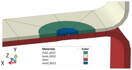 The local stress state was analyzed using finite element analysis software in ABAQUS 2020. A three-dimensional model of the coach peel specimen was created using C3D8R brick elements with reduced integration. The model included the fusion zone, heat-affected zone (HAZ), and base metal regions (Figure 3). The material properties for these regions, determined from shear tests [4], were incorporated into the simulation. Boundaries were applied at both ends of the model. The Y displacement of the bottom surface was tied to the reference points, which were fixed in the loading direction, i.e., the Y direction. To prevent movement in the horizontal plane, the X direction was constrained for both the top and bottom-back edge, ensuring the vertical alignment of the top and bottom parts throughout the experiments. The local stress, i.e., the shear stress and tensile stress at the interface, was calculated. In addition to the AA6022-LCS RSWs with varying weld nugget diameters, the stack-ups studied in previous work (Table 4) [4,13] were also simulated. The stress triaxiality and Ap were calculated and plotted against the weld nugget diameter of the coach peel specimens to reveal the mechanism behind the tensile fracture modes.