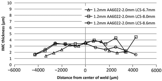 Maintaining the uniformity of the IMC layer thickness during resistance spot welding with varying weld nugget diameters was challenging. A thicker IMC layer usually formed in RSWs with larger weld nugget diameters due to the greater heat generated during welding. In the present study, the 1.2 mm AA6022 sheet and LCS sheet were resistance spot welded using a higher weld current to create aluminum weld nuggets with a larger diameter (Figure 5). The IMC layer thickness profiles in all stack-ups were found to be similar (Figure 5). More specifically, the average IMC layer thickness at the periphery (within 1 cm from the weld nugget edge) was 2.0 μm for AA6022-LCS-6.7mm, and 2.2 μm for AA6022-LCS-8.0mm and AA6022-LCS-8.6mm. At the center of the weld nugget, the IMC layer thickness was slightly greater than 3 μm.