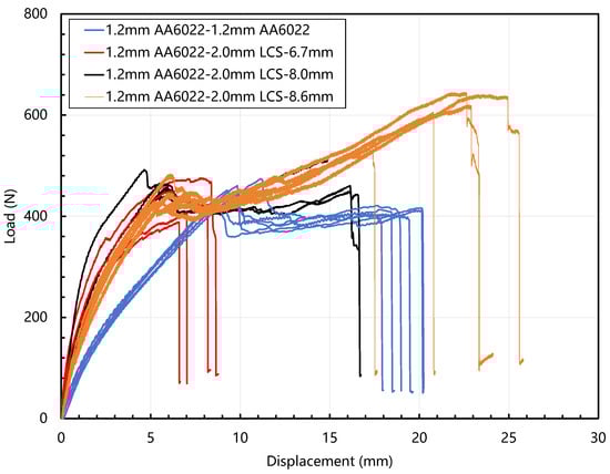 Tensile curves of AA6022-AA6022 and AA6022-LCS stack-ups in coach peel configurations.