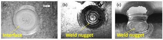 Generally speaking, there are two typical fracture modes during mechanical testing for aluminum to steel RSWs: interfacial fracture and pull-out fracture. The interfacial fracture mode should be avoided due to its unpredictability, resulting from brittle fracture. For the tensile shear configuration of dissimilar aluminum-to-steel RSWs, achieving a weld nugget with a sufficiently large diameter is crucial in obtaining a desirable pull-out fracture mode during tensile tests [3,4,5] and when aiming to achieve a long fatigue life [6]. Until now, numerous techniques have been devised to calculate the critical diameter of weld nuggets to prevent interfacial fracture in tensile shear specimens [7,8,9,10,11,12]. The leading author and her colleagues [4] recalculated the critical weld nugget diameter for Al–steel RSWs considering material inhomogeneity and successfully predicted the fracture modes in aluminum-to-steel specimens with tensile shear configuration. However, these methods were only suitable for tensile shear configuration and inadequate for coach peel specimens, where a noteworthy observation was the occurrence of pull-out fracture modes even when the weld nugget diameters were smaller than the critical diameter [13].
