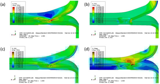 Stress contour of (a) tensile stress S11, (b) tensile stress S22, (c) tensile stress S33 and (d) von Mises stress of 1.2 mm-thick AA6022-2.0mm-thick LCS specimens.