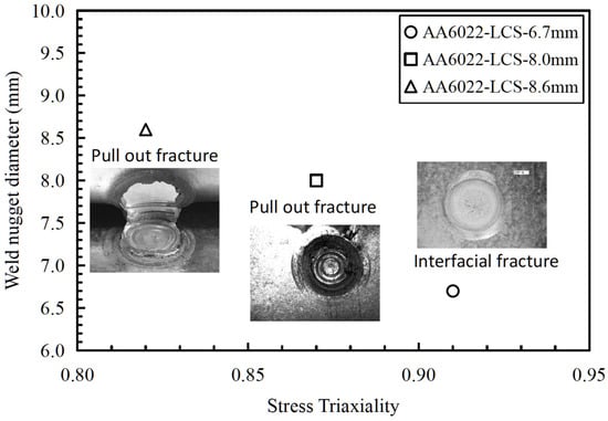Additionally, the stress triaxiality was calculated to be 0.84 at a low fatigue load range (80 N) and 0.99 at a high fatigue load range (166 N) for the AA6022-LCS-6.7mm stack-ups with a nugget diameter of 6.7 mm. The fatigue fracture mode for the load range of 80 N was interfacial. The fatigue fracture mode for the load range of 166 N was pull-out. The calculated stress triaxiality under both load ranges is plotted in Figure 14. The two points are located at the two sides of the trend line, which indicates that stress triaxiality is also an effective constraint parameter in predicting the fracture modes for fatigue testing.