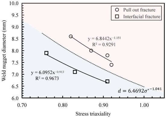The stress triaxiality of all stack-ups listed in Table 4 were calculated and plotted in Figure 10. The pull-out fracture modes and interfacial fracture modes are represented by circle and square symbols, respectively. Interestingly, two distinct trend lines for the pull-out and interfacial fracture modes are evident in Figure 10. When the stress triaxiality and weld nugget diameter were larger, the fracture mode tended to be pull-out. Conversely, when these factors were smaller, the fracture mode was interfacial. Therefore, the fracture mode of the coach peel stack-ups was affected by both the weld nugget diameter and the stress triaxiality. The trend line in the middle of the pull-out and interfacial lines (dotted line) is plotted in Figure 10 with the fitting equation of .