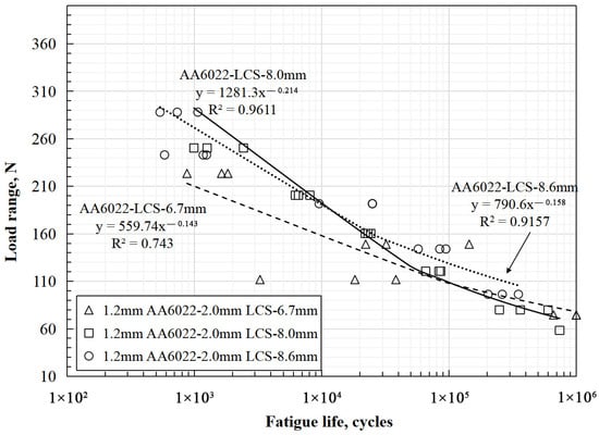 A comparison of the fatigue life of the AA6022-LCS-6.7mm, AA6022-LCS-8.0mm and AA6022-LCS-8.6mm stack-ups in coach peel configurations is presented in Figure 11. It was observed that the fatigue life of AA6022-LCS-6.7mm, with a smaller weld nugget diameter, was the shortest. Increasing the weld nugget diameter to 8.6 mm resulted in the longest fatigue life for the stack-ups. At lower load ranges, there was little variation in the fatigue life between the AA6022-LCS-6.7mm and AA6022-LCS-8.0mm stack-ups. However, a decrease in the weld nugget diameter led to greater variability in the fatigue life. For the AA6022-LCS-6.7mm stack-ups, the fitting coefficient was found to be 0.743.