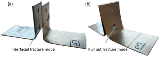 Fracture modes of fatigue specimens of AA6022-LCS RSWs with a smaller weld nugget diameter. (a) Interfacial fracture mode when the load range was 75 N. (b) Pull-out fracture mode when the load range was 224 N.