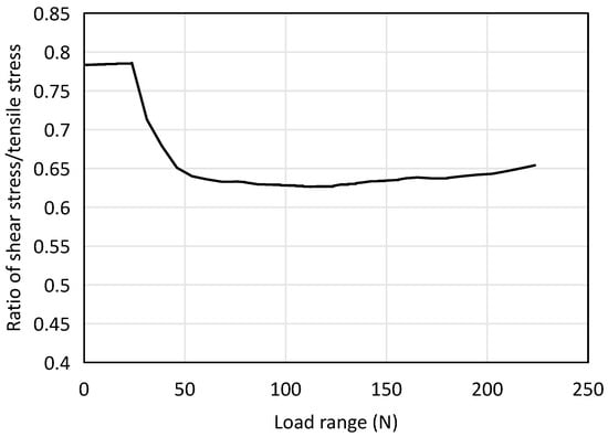 Ratio of shear stress to tensile stress at different load ranges for the 1.2 mm AA6022-LCS-6.7mm stack-up.