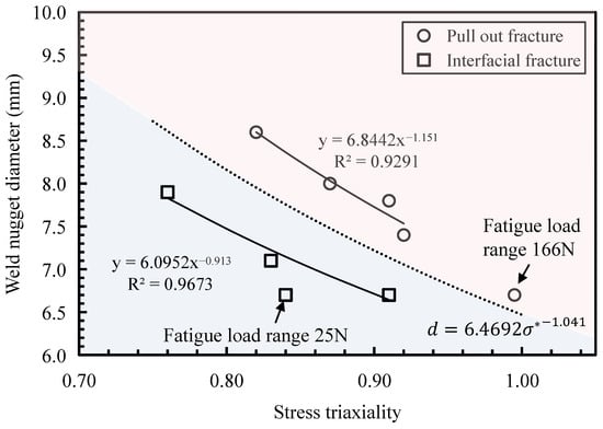 Predicting fatigue fracture modes using weld nugget diameter and stress triaxiality. The pink area represents the pull-out fracture mode, and the blue area represents the interfacial fracture mode.