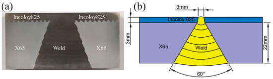 Macroscopic drawing of welded joint of Incoloy825/X65 composite pipe: (a) test sample, (b) Schematic diagram of welding sequence.
