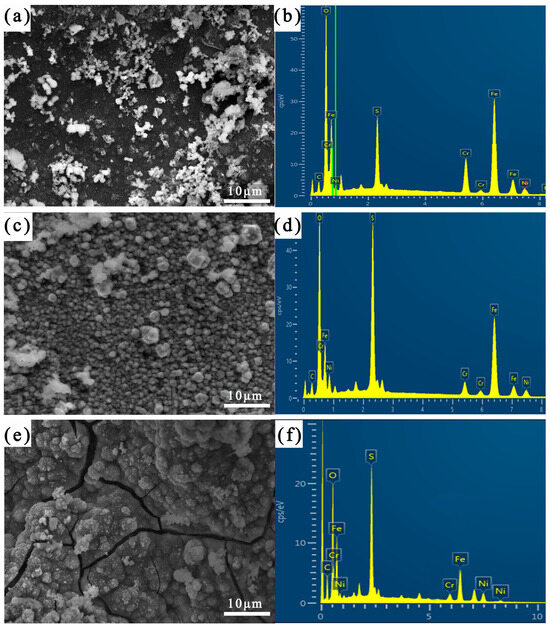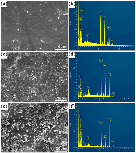 The metallic passivation films (the main components of NiO and Cr2O3) formed on the surface of nickel-based alloys can protect the substrate from corrosive ions. With a large number of corrosive ions gathered on the surface of the alloy, according to Macdonald’s point defect model [8], the oxygen vacancies in the passivation film on the surface of the alloy migrate to the junction between the passivation film and the corrosive medium, the polarity of S2− is higher than that of Cl− and OH−, and the S2− will be adsorbed into the oxygen vacancies first, and a small amount of dissolution occurs in the oxygen vacancies in the passivation film after they are occupied by S2−. After the partial dissolution of the passivation film, metal ions such as Ni2+, Fe2+, and Fe3+ in the nickel-based alloy matrix diffuse between the corrosion medium and the metal matrix, and Cr3+ is mainly distributed on the surface of the matrix as Cr2O3 [9]. From Figure 2, it can be seen that the Incoloy825 region and the HAZ have a high elemental content of Fe, Cr, and Ni, and the weld has a low elemental content of Fe. Metal cations such as Ni2+, Fe2+, and Fe3+ from the Incoloy825 region and the HAZ are combined with the S2− in the solution, and corrosion products such as FeS and NiS are formed on the surface of the specimen, and the corrosion products on the surface of the weld mainly consist of NiS. As shown in Table 2, after 7 days of immersion in the elemental sulfur corrosive environment, the HAZ’s surface contains the most S, which indicates that the bimetallic composite pipe’s welded joints in different regions experience different intensities of S elemental corrosion in the following descending order: the HAZ, the weld seam, and the Incoloy825 region. Moreover, there is a lack of the Cr element near the fusion line in the HAZ, which results in poor corrosion resistance in the heat-affected zone under the S element corrosion environment. The passivation film on the surface of the sample dissolves and forms sulfides.