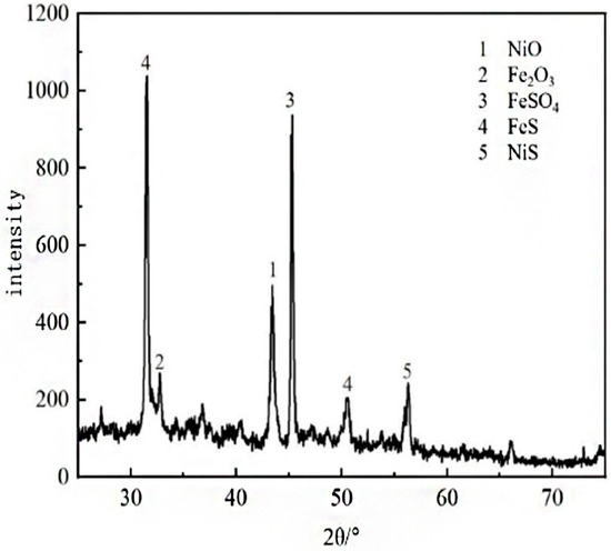 Figure 2 shows the corrosion morphology of different regions after 7 days of immersion. Table 2 shows the results of the EDS analysis of the corrosion product film. As can be seen in Figure 2, the corrosion product film on the surface of the specimen is not uniformly covered, and there are small particles scattered on the surface of the substrate. From the EDS analysis results, it can be seen that the corrosion product film on the surface of the specimen after 7 days of corrosion by sulfur is mainly composed of O, Fe, Cr, Ni, S, and other elements, of which the content of the O element is the highest, and the content of the S element is the lowest. The HAZ has the greatest amount of corrosion product, followed by the weld zone, and in the Incoloy825 region, the least corrosion occurs, which indicate that the heat-affected zone of the welding joint is the preferred region for sulfur corrosion. This might be due to the S2− or SO42− ions formed from the simple hydrolysis of the substance S at higher temperatures. Figure 3 shows the XRD pattern of the corrosion products, and it can be seen that the main components of the corrosion products are FeS, NiS, Fe2O3, FeSO4, and NiO.