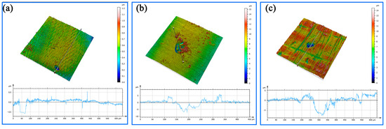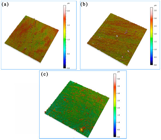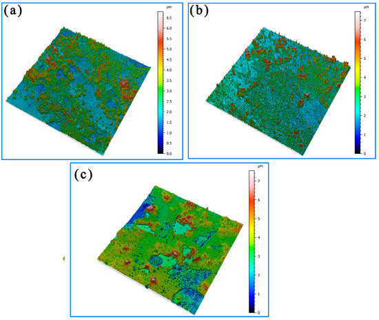The three-dimensional morphology of the corrosion in different areas of the welded joints of the bimetallic composite pipes after 7 days of immersion in the corrosive S element environment according to confocal microscopy is shown in Figure 4. It can be seen that the thickness of the corrosion product film is 1.5–3 μm, and the thickness of the product film is thin and unevenly distributed, and the average thickness of the product film in the different areas of the welded joints is in descending order as follows: the HAZ, the weld, and the Incoloy825 region.