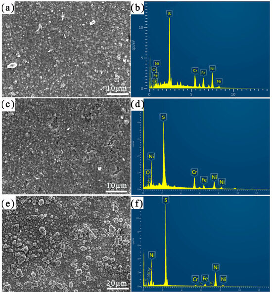 The corrosion product film on the nickel-based alloy’s surface in sulfur-containing environments has a double-layer structure, with the outer layer consisting of NiS and Cr2S3 and the inner layer dominated by chromium and nickel oxides [8,9]. The Cr2S3 possessed a stable structure and could act in conjunction with the inner membrane oxide to protect the substrate [12]. In the process of the localized corrosion of the occlusion cell, the chromium ions inside the nickel-based alloy matrix were continuously released and diffused into the matrix/corrosion layer interface. Compared with the nickel element, O2− and S2− were more inclined to react with Cr to form structurally stable Cr2S3, thus inhibiting the generation of nickel sulfide [13]. As the corrosion process continued, Ni2+, Fe2+, Cr3+, and other metal ions were consumed and dissolved in the corrosion medium, which led to a substantial decrease in the content of metal elements in the corrosion product film.