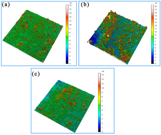 Three-dimensional topography of the surface after corrosion for 14 days: (a) Incoloy825, (b) HAZ, and (c) weld zone.
