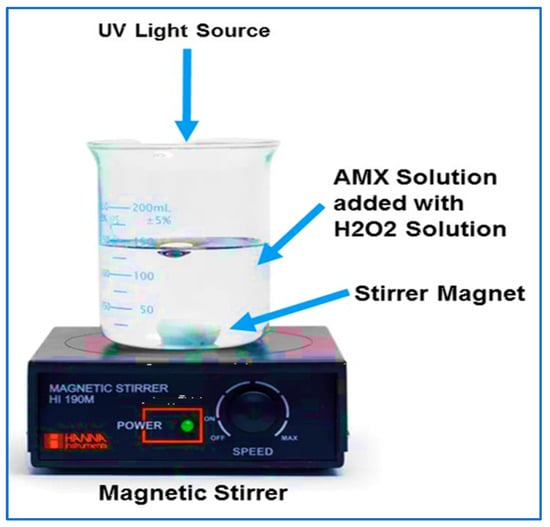 | 17 | UV/H2O2 | UV Irradiation, 50 mW/cm2 Intensity, Input Voltage 230 V, 50/60 Hz, 50 mL AMX Solution 1 mg/L, 30% H2O2 3 mL, pH 9, 25 °C | 100 | 1.3 | This Work |