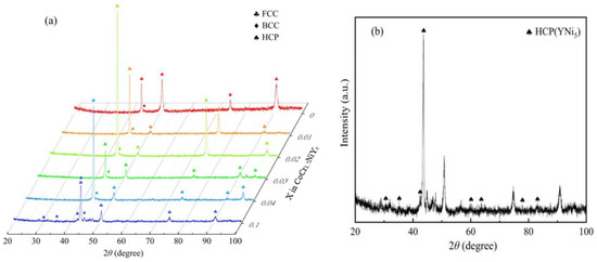 - Without the addition of Y, the Y-0 alloy matrix has an FCC phase structure. The volume fraction of Cr-rich BCC precipitates was lower. The YNi5 HCP precipitate formed in Y-0.01 MEA. The volume fraction of BCC and HCP phase precipitates increased with Y content, which led to the precipitation and dispersion strengthening of CoCr1.7NiYx MEAs.