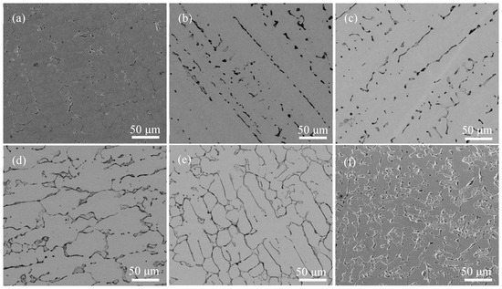 To evaluate the mechanical properties of the alloys at room temperature, microhardness tests and compression tests were carried out at room temperature. The microhardness tests were performed with a micro Vickers hardness tester (HVS-1000A, Jinan Hensgrand Instrument Co., Ltd., Jinan, China) under a load of 0.5 kg for 15 s. For each sample, 20 points were measured and averaged to ensure the accuracy of the measurement. The samples for microhardness tests were sliced into 10 × 10 × 0.3 mm by WEDM. Compression tests were performed using a universal electronic compression tester with a strain rate of 1 × 10−3 s−1. The samples for compression tests were sliced into φ 4 × 6 mm by WEDM.
