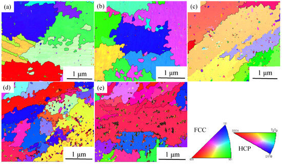 Figure 3 displays a succession of EBSD maps for Y-0.01, Y-0.02, Y-0.03, Y-0.04, and Y-0.1. The alloy possessed equiaxed grains, but the grain sizes were not consistent. Additionally, the photos showed deformation twinning. Twins typically arise when the energy of the stacking fault is low [28]. The emergence of twin boundaries restricts the dislocations’ motion, which lowers SFE. As a result, the twins in the metal would promote the high yield strength of the alloys. The fraction of twin borders only marginally rose with the rise in Y-doping content, according to the results.