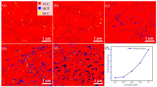 The above analysis shows that the increase in Y content would promote the enrichment of Y and Ni, which led to the increasing volume fraction of YNi5 HCP precipitates. According to the TEM-EDS patterns of Y-0.3 (Figure 5b–e), the HCP phase contains only a small amount of Co in addition to Y and Ni. This indicated that YNi5 replaces the original Cr position and thus promotes the enrichment of Cr to precipitate the BCC phase. Therefore, the volume fraction of the BCC phase also increased with the increase in Y content.
