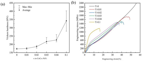 Figure 6a shows the experimental result of the microhardness of CoCr1.7NiYx MEAs at room temperature. Table 1 shows the increase in (compared to Y-0) and the averages of microhardness of CoCr1.7NiYx MEAs at room temperature. Compared with Y-0 MEA, the microhardness of Y-0.01 and Y-0.02 MEAs increased slightly (less than 10.00%), the microhardness of Y-0.03 and Y-0.04 MEAs was improved significantly (25–35%), while the microhardness of Y-0.1 MEA increased to 342.358 HV (an increase up to 98.17%). As shown in Figure 6a, the maximum, minimum and range values of the hardness data measured for each alloy also maintained an increasing trend. Since the test sites of microhardness were randomly selected, the hardness measured was relatively low when the test site was on the FCC matrix and relatively high when the test site was on the HCP precipitate. The maximum value of each set of data increased with the increase in Y content, indicating that the increase in Y content raised the volume fraction of the HCP precipitated phases. In this process, the range value of each dataset also increased with the increase in Y content, indicating that the increase in hardness of the HCP precipitated phase is larger than that of the FCC matrix hardness. The above results show that the increase in Y content would increase the microhardness of CoCr1.7NiYx significantly through solid solution strengthening and precipitation strengthening, and the contribution of precipitation strengthening to hardness is higher than that of solid solution strengthening in this system. Therefore, we believed that the improvement of the mechanical properties of CoCr1.7Ni HEA by adding Y was mainly attributed to precipitation strengthening.