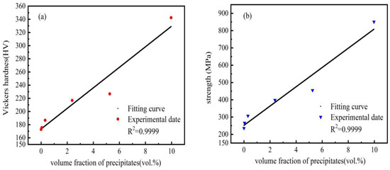 Microhardness (a) and yield strength (b) as functions of volume fraction of precipitates.