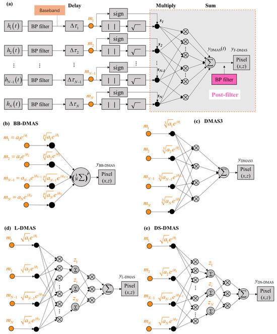 Schematic diagrams of the DMAS nonlinear beamforming imaging algorithm and the extended algorithms. (a) F-DMAS, (b) BB-DMAS, (c) DMAS3, (d) DS-DMAS, and (e) L-DMAS algorithm.