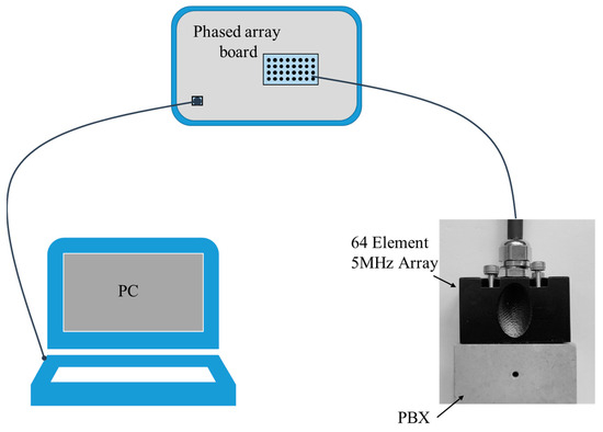 The experimental setup for ultrasonic data acquisition, as shown in Figure 3, consisted of an ultrasonic array, a phased array board, and a personal computer. A fully parallel 64-channel phased array system (CTS-PA22T; Guangdong Goworld Co. Ltd., Shantou, China) was employed in the experiments. The emission voltage of this system was set at 100 V, with a pulse width of 100 ns and a sampling frequency for FMC data of 62.5 MHz. A 64-element phased array transducer (5L64-0.5X; Guangdong Goworld Co. Ltd., Shantou, China) was utilized to conduct the ultrasonic experiments. The transducer is a linear array with a nominal central frequency of 5 MHz, a 0.5 mm pitch, and a 10 mm element length. Water was chosen as the coupling medium for the measurements. In this study, the effects of temperature and stress on the ultrasonic measurement of PBXs were not considered.