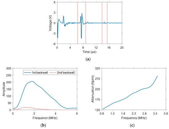 Ultrasonic velocity and the attenuation coefficient are two key parameters that affect imaging quality. To realize accurate measurements, the experiments were conducted on the defect-free areas of the PBX specimens before post-processing imaging. Due to the low emission energy of the multi-element phased array transducer, it was difficult to obtain an effective secondary bottom surface echo. Therefore, we used a traditional 5 MHz single probe for the experiment, with a sampling frequency of 200 MHz. To minimize the experimental errors, A-scan signals were captured at multiple positions on the specimens. Figure 4a shows a set of typical A-scan signals measured. The primary and secondary echoes from the bottom surface were easily obtained and are marked by the red boxes in Figure 4a. With the propagation distance and the arrival time difference between the first and second bottom surface echoes, the velocity of the longitudinal wave propagating in the PBX sample was calculated as 2828 ± 116 m/s.