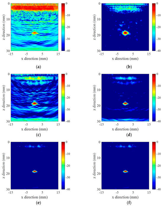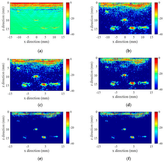 Reconstructed images of PBX sample with multiple SDHs: (a) conventional TFM, (b) F-DMAS, (c) BB-DMAS, (d) DMAS3, (e) L-DMAS, and (f) DS-DMAS.