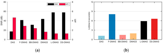 The above formula was used to calculate the SNRs and APIs of the defects in the reconstructed images (in Figure 5) by six different imaging methods, and the results are shown in Figure 7a. Compared with traditional DAS, these nonlinear beamforming imaging methods can improve the signal-to-noise ratio and the resolution of an image. Compared to DAS, the average SNR of F-DMAS defects was improved by ~24.22 dB, while the API was reduced by ~38%, but the time of F-DMAS was significantly increased by about 1005 times, which hinders real-time imaging. With the introduction of the BB-DMAS algorithm, the imaging time of the algorithm was significantly reduced. When the improved DMAS3 was employed, it achieved better SNR (about a 2.38 dB improvement) and API metrics (about a 43% reduction) compared to F-DMAS, and the imaging time was reduced by around 459 times. In addition, compared with BB-DMA and DMAS3, L-DMAS and DS-DMAS utilize a two-stage pairing multiplication approach. This method algorithmically enhances the ratio of coherent signals (such as defects) to incoherent signals (such as noise), but it also increases the computational complexity of the algorithm. Consequently, L-DMAS and DS-DMAS achieved the highest image quality; however, the reconstruction time was significantly increased, as shown in Figure 7b.