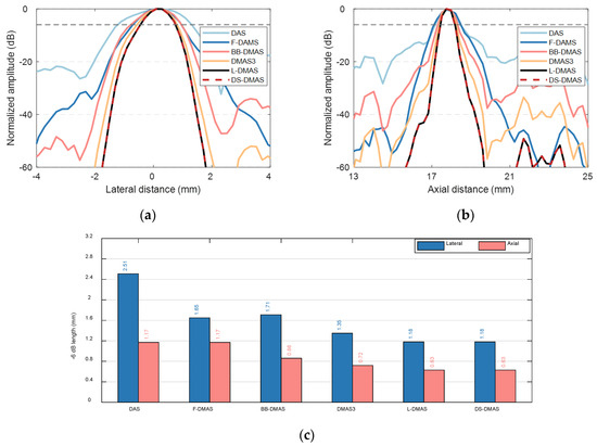 The lateral (a) and axial (b) normalized amplitude variations of the reconstructed images at the flaw. (c) The −6 dB lateral and axial widths of the six kinds of algorithms.