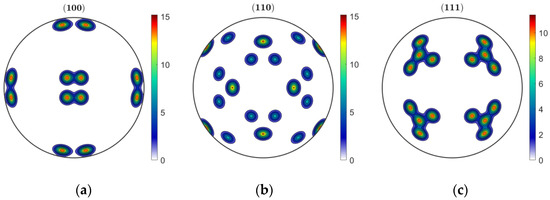 The reported papers have proven that the texture of the casting 4.5 Si steel and 6.5 Si steel fabricated by TSC was predominantly characterized by λ-texture, and the microstructure was predominantly composed of columnar crystals characterized by <001>//ND [19,20,21]. During model establishment, in regard to the studied 6.5 Si steel, a 500 cube crystallographic orientation (CRO) structure with misorientation of ±15° together with 500 randomly generated CROs were utilized by referring to references [21,22], and every CRO was assigned to single grains, and the accumulated intensity of every CRO was regarded as volume fraction of different grains. Eventually, the MTEX toolbox [23,24] was utilized to display the CRO by utilizing a pole figure as shown in Figure 2. During the establishment of the VPSC model, the three-dimensional dimensions of grains for the studied strip processed by TSC was similarly regarded as the initial grain size, and the grain diameters and aspect ratio corresponding to different sections introduced in Section. 2.1 were selected as the initial parameters.