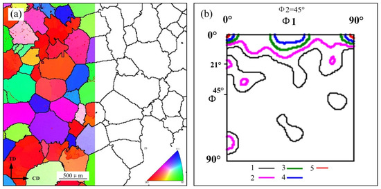 Crystallographic orientation feature of the investigated 6.5 Si steel. (a) Orientation and grain boundary distribution graph. (b) ODF (phi2 = 45°).