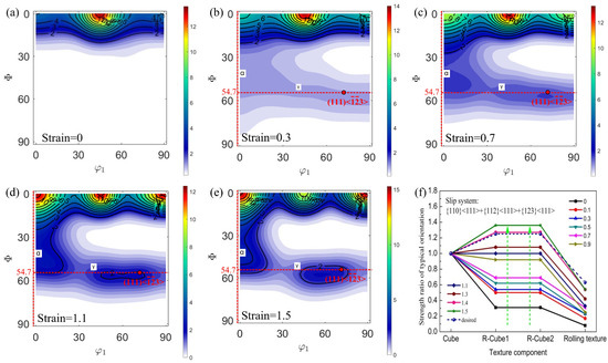 In accordance with the calculation results reported by our research team [15], the transformation rate from the initial CRO to the actual CRO achieved through EBSD detection was the fastest as comparing to the other single or multiple slip systems when the multiple slip system of was activated with respect to 6.5 Si steel. Hence, the multiple slip system of is adopted to estimate the deformation strain involved in the TSC, considering the crystal–plasticity theory. In the present study, the evolution feature of the CRO is utilized to estimate the deformation strain involved in the plastic deformation process in the HTMZ. Figure 4 shows the variation discipline of the CRO with an increasing deformation amount for the studied 6.5 Si steel under activation of the multiple slip system. It was identified that the initial texture component of the investigated steel is predominantly composed of a Cube texture before deformation, as shown in Figure 4a, and the maximum distribution intensity is determined to be ~12. With the increase in deformation amount, the distribution intensity of the Cube texture is gradually decreased, and the distribution intensities of R-Cube1 and R-Cube2 are both obviously increased, as shown in Figure 4b,c. With the deformation strain increased to 1.1, the distribution intensity corresponding to the R-Cube texture is evidently increased, with maximum intensity of 10, and the max distribution intensity corresponding to R-Cube is increased to 11 at the deformation strain of 1.5, accompanied by the max distribution intensity corresponding to Cube decreasing to 10. In addition, the distribution intensity corresponding to the typical texture distributed on the α-fiber and γ-fiber are obviously increased, with the deformation strain increased from 0.3 to 1.5, as shown in Figure 4b–e. Generally, the α-fiber and γ-fiber are the typical oriented aggregation area of the BCC metal in the ODF figure, and they are usually induced by plastic deformation [25]. The λ-fiber is the typical oriented aggregation area of the BCC metal in the ODF figure, which is mainly attributed to the solidification process [26]. In this study, the γ and α fibers are strengthened with increasing deformation, indicating that the deformation process plays a certain role during the TSC process in regard to the studied 6.5 Si steel due to the TSC process being a coupling process of solidification and deformation. However, the influence of deformation on the formation of the CRO feature for the investigated 6.5 Si steel is limited due to the maximum of intensity corresponding to the typical texture of only reaching up to 2 at the deformation strain of 1.5, as shown in Figure 4e. Hence, it could be deduced that the evolution of CRO for the investigated 6.5 Si steel under TSC follows the discipline: the initial texture of Cube derived from solidification is inclined to transform into the R-Cube texture with the increase in deformation strain under the load of plane strain deformation. At the same time, some grains with a random CRO are inclined to transform into the texture distributed on the γ-fiber under the application of plane strain deformation.