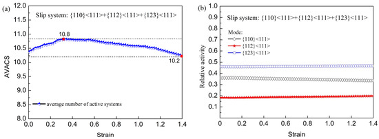 The calculated results associated with the deformation mechanism of the studied alloy. (a) Average number of active systems. (b) Relative activity induced by different slip systems considering the multiple slip system of .