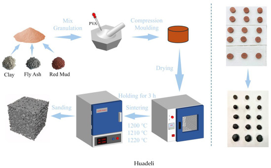 Class I fly ash (produced from coal, classified as Sialic and Inert type according to Vassilev’s chemical and phase classification, respectively) sourced from a power plant in Jinan, red mud obtained from the Ling Shou Yixin Mineral Products Processing Plant, and clay from the Yangquan Huayicheng Refractories Factory were utilized as raw materials. Polyvinyl alcohol (PVA, Aladdin, China) served as the binder, while silicon carbide (Tianjin Yetai, Sanhui, China) acted as the foaming agent.