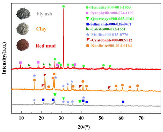 The chemical compositions of fly ash and red mud are presented in Table 2. Fly ash predominantly consists of SiO2 (54.09 wt.%) and Al2O3 (30.80 wt.%), with relatively low concentrations of other chemical components, which is a characteristic feature of fly ash [39]. Red mud exhibits a high content of Fe2O3 (36.19 wt.%) and Al2O3 (19.44 wt.%). In terms of crystalline phases (Figure 2), sillimanite (Al2SiO5, PDF#00-038-0471), quartz (SiO2, PDF#00-003-1161), and mullite (3Al2O3·2SiO2, PDF#00-015-0776) are identified as the main crystalline phases in fly ash. Mullite (3Al2O3·2SiO2, PDF#00-015-0776), cristobalite (SiO₂, PDF#00-082-0512), and kaolinite (2SiO₂·Al₂O₃·2H₂O, PDF#00-014-0164) are the main crystalline phases in clay. Meanwhile, hematite (Fe2O3, PDF#00-001-1053) is present in the red mud, as well as calcite (CaCO3, PDF#00-072-1651) and pyrophyllite (Al2[Si4O10](OH)2, PDF#00-074-1193).