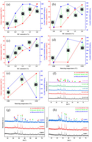 Macrostructure, linear expansion rates, and vertical expansion rates of samples sintered at (a) 1200 °C, (b) 1210 °C, and (c) 1220 °C, alongside differing SiC contents: (d) 0.5 wt.% SiC and (e) 1 wt.% SiC; XRD patterns of samples sintered at (f) 1210 °C with different SiC contents, sintered at different temperatures with: (g) 0.5 wt.% SiC, (h) 1 wt.% SiC.