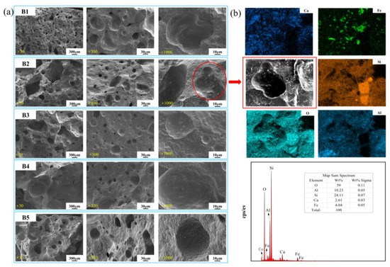 Figure 4a illustrates the micromorphology of the pore structure in samples sintered at 1210 °C with varying SiC contents. (0%, 0.5 wt.%, 1 wt.%, 1.5 wt.%, and 2 wt.%). The results show that micropores appeared on the surface of samples. In addition, where visible, it is evident that no visible pore windows were formed on the inner surfaces of the pores, which suggests the domination of closed pores, reaching the most homogeneous at a SiC content of 1 wt.%. The small pores continuously merged to form connected open pores, which led to an increase in the diameter of the sample pores, which was favorable to the penetration of water molecules, and this coincided with the effect of SiC content on water absorption. The elemental distributions of B2 samples were determined by EDS (Figure 4b). The main elements identified were O, Si, Ca, Fe, and Al, which are consistent with the chemical composition analysis results of fly ash and red mud presented in Table 1. Moreover, an enrichment of Fe elements was observed, which is consistent with the existence of hematite analyzed by XRD, and can significantly enhance the brittleness of the samples and reduce the strength.
