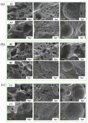 SEM images of samples added with SiC contents of 0.5 wt.% (A2, B2, C2), 1 wt.% (A3, B3, C3), with resolution of ×30, ×300, and ×1000 from left to right, respectively; taken at temperatures of: (a) 1200 °C, (b) 1210 °C, and (c) 1220 °C.