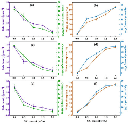 Differences in the structure and crystalline phase of a material can significantly influence its properties. Therefore, we systematically evaluated the compressive strength, bulk density, apparent porosity, and water absorption of samples prepared with different SiC contents and sintering temperatures, as illustrated in Figure 6.