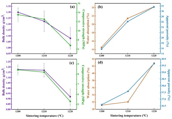 Compressive strength, bulk density, apparent porosity, and water absorption of foamed ceramics prepared at various sintering temperatures (1200 °C, 1210 °C, 1220 °C) with SiC content of (a,b) 0.5 wt.%, (c,d) 1 wt.%.